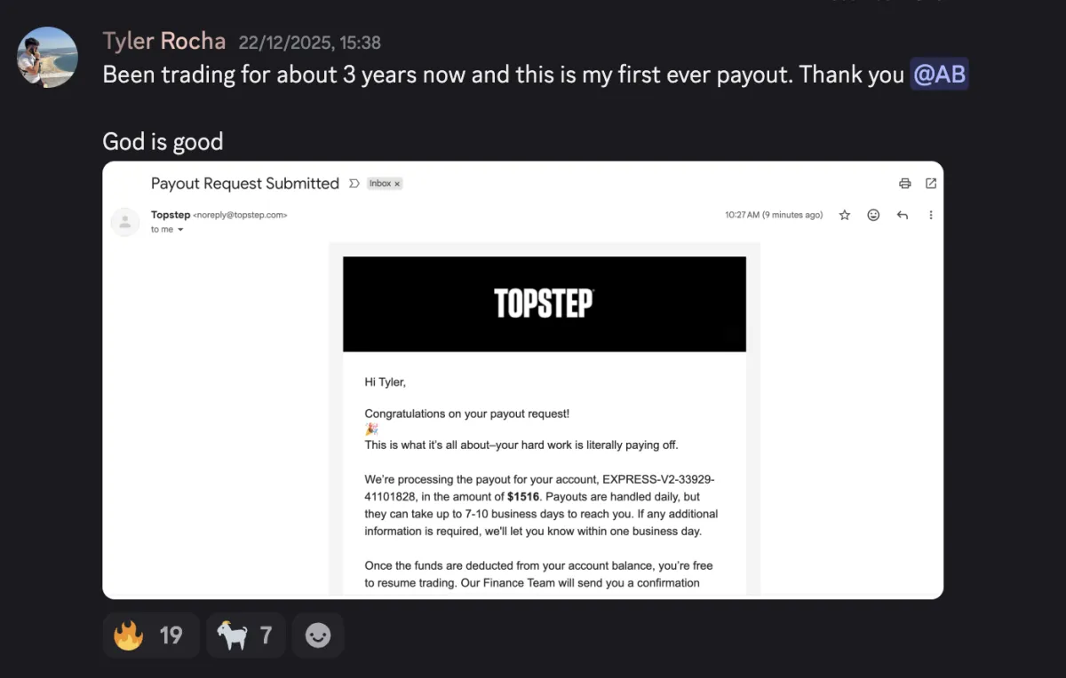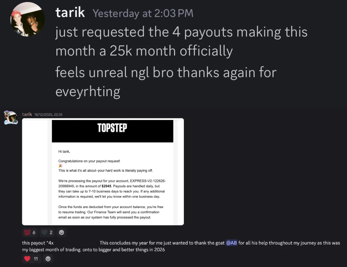 RESULTS DISCLAIMER: The testimonials, trading results, and payout figures displayed on this page are from real students and reflect their individual experiences. These results are not typical. Most people who attempt day trading lose money. Your results will depend on many factors including but not limited to: your background and experience, your commitment and discipline, market conditions, the time and effort you invest, and your ability to follow a structured process. We cannot and do not guarantee that you will achieve any specific result, or any result at all.